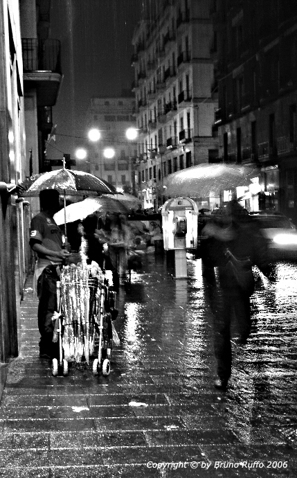 scrosci di pioggia, mentre gli ombrelli cedono alle intemperie.